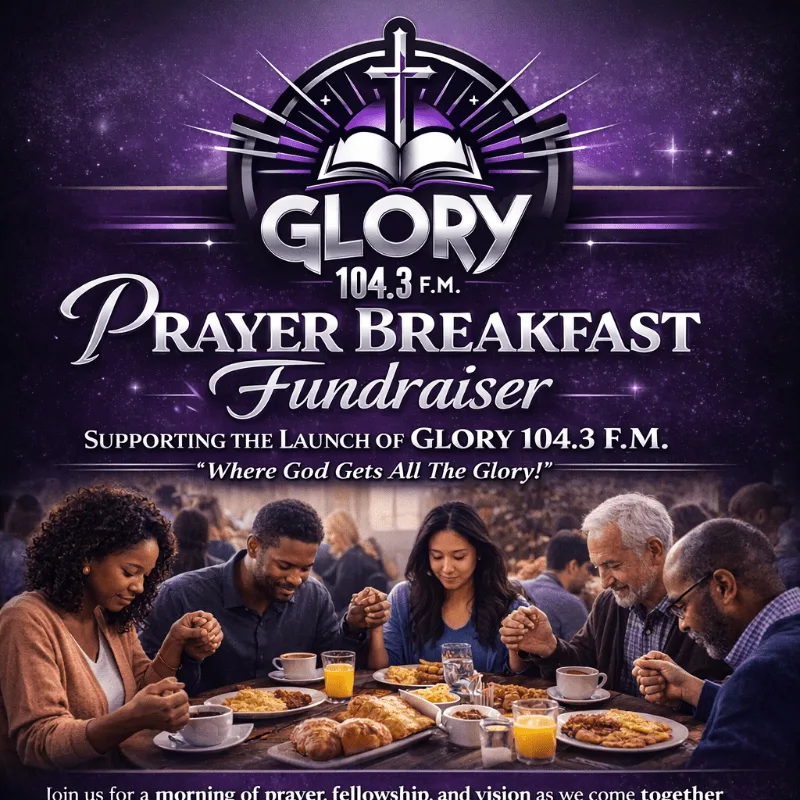 Glory 104.3 FM is being built with a clear mission: to glorify God and strengthen the body of Christ through worship, teaching, and meaningful conversations. Every ticket purchased for the Prayer Breakfast directly supports the station’s launch — ensuring that this new voice of encouragement can begin broadcasting with strength and purpose.
